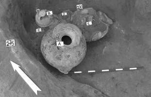 The Mycenaean cemetery was revealed in the SW end of the Trapeza plateau. The pottery assempled was dated between the late Helladic times (LHII-IIIA) and the Geometric times. Some Geometric vessels were revealed intact (fig. 4), on top of a layer which must have sealed off the burials on a deeper level. One of the vessels bore an intricate decoration, with safe dating during the LHIIIC-submycenaean times.