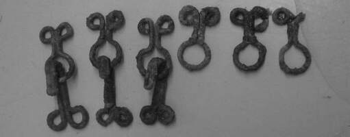 A survey on the area where the two skulls were found revealed that there were rows of burials, oriented E/SE-W/NW, with the head on the W side. The rescue excavation in situ unveiled three burials (fig. 6), dated around the same time. Their orientation, as well as their general appearance, indicated that they were probably Christian burials (fig. 7). One of the individuals had coal in their stomach area, and the skeletons seemed to be in a rather good preservation state and in the correct anatomical position. Some sort of chain jewelry was found between the legs of two of the burials. Upon better investigation, the chains revealed to be the press-studs which held the deceased’s shoes or pants in place (figs. 8, 9). The chain must have buckled on the deceased’s hip (as signs of rust were found in the same spot on the bone), which indicated that the shoes the deceased wore must have been poulaine style. This shoe type had a large extension at the front side of the shoe, mimicking the ship’s prow, and it first appeared around 1350. It was only in use until 1400, due to the fact that it was uncomfortable for the knights to wear during battle.