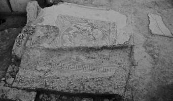 In the central housing block (fig. 1) there were the foundations of a house with three quarters. It was organized around a central open yard (atrium) which connected areas linked with very different activities in the house. In the S/SE of the atrium there were some subterranean storage areas (arrangement of many pithoi and kitchen area), while there were also some homebound workshop areas, built to attend to the housing unit’s needs. The andron was located in the E half of the house, and it was fit to house seven beds. The room had painted decoration on the walls (as was conducted by the red and blue traces of paint on the mortar) and the floor was adorned with a mosaic, depicting lions attacking cattle and other farm animals (fig. 2). Finally, the house had its own altar, situated on one of its most central areas (fig. 3).