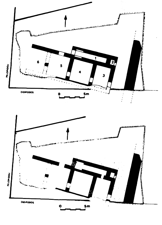2) La suite des bâtiments du terrain D. Liangas a été dégagée dans un terrain voisin, à l'Ouest de celui-ci (angle des rues Oedipodos et P. Oikonomou). Les deux phases de construction datent de l'HR IIIΒ ; mais le premier incendie daterait ici de la fin de l'HR IIIΒ1 ; immédiatement reconstruit, le bâtiment fut à nouveau détruit dans un incendie à la fin de l'HR IIIΒ2. Le site semble avoir été réoccupé à l'HR IIIC, puis abandonné et utilisé seulement pour des tombes submycéniennes, sans offrandes. Les vestiges HR IIIΒ dégagés pourraient être liés au palais.