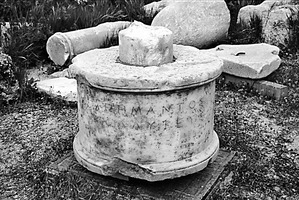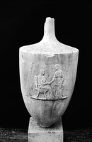 Moschato. Test trenches at Thessalonikis 90−92, in a probable cemetery area outside the southern arm of the Long Walls, produced a fourth-century BC marble lekythos (Fig. 1) preserving the scene of a dexiosis between a seated old woman wearing a chiton with a himation covering her head and a standing young female dressed in a long chiton, belted peplos and himation. Further along the same street (no. 42, Photopoulou property) was a fourth-century inscribed marble cylindrical base for a loutrophoros with part of the foot still leaded into it: it is inscribed ΑΠΗΜΑΝΤΟΣ ΚΟΛΛΥΤΕΥΣ (Fig. 2).