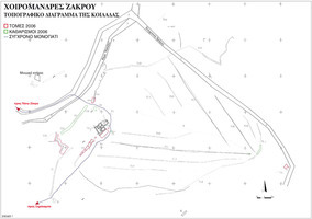 — Lors de la prospection dans l’Ouest de la vallée, un petit site protopalatial a été repéré, avec une céramique MM IIB comparable à celle du poste fortifié. Un petit bâtiment, permettant de surveiller la route menant vers Pano Zakros y surmontait une terrasse construite. Deux puits modernes ont aussi été repérés à proximité du poste fortifié.