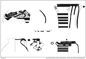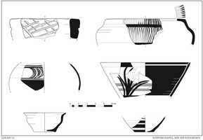 Étude du matériel. — Le matériel de la moitié Nord du poste fortifié a été étudié en 2005. Il s’agit probablement d’espaces résidentiels, ce qui expliquerait la rareté du mobilier. Au Sud, la grande pièce dallée apparaît comme la salle centrale de l’habitat, comme le montrent les vases domestiques et la vaisselle à boire. La même séquence stratigraphique a été observée dans l’ensemble du bâtiment (fig. 2) : la première occupation du site remonte au MM IB-IIA. Les figurines mises au jour sur la terrasse occidentale du bâtiment doivent probablement être associées à un sanctuaire à cet endroit (une nouvelle tête de figurine féminine provient des sondages de 2006), avant que le site ne change de fonctions. Les premières constructions dateraient du MM IIB (gobelets coniques, tasses tripodes, hémisphériques, carénées ou droites (fig. 3). Ce premier bâtiment est détruit au MM IIIB, avant d’être rebâti au début du MR IA (tasses galbées, coupelles tronconiques). La dernière phase d’occupation date du MR IB, avant une destruction à la fin du MR IB, avec un matériel comparable à celui de Kato Zakros, du « Fort » de Karoumès et de Palaikastro et Mochlos. (fig. 4) Le matériel MR IIIA est peu abondant et provient principalement du Sud (petit bâtiment) et de la pièce VI, où un petit sanctuaire aurait été aménagé. Le site est définitivement abandonné à la fin du MR IIIA1 ou au début du MR IIIA2, comme plusieurs autres établissements ruraux.