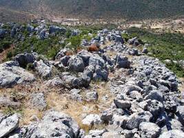The fortified citadel on the hill Kastraki Keratitsa is located on a secluded plateau, north of the present village of Agios Dimitrios, in southeastern Laconia. Surface research showed the existence of an Early Helladic settlement in the area around the hill, while the preliminary study of the material does not document a later settlement in the area or immediately around it. In the area west of the site, abundant Early Helladic pottery and pieces of obsidian were found, in contrast to the area inside the walls, where the finds are much less. It is possible that the citadel served as a refuge for the inhabitants of the surrounding plain. During the on-site study in 2010 and 2011, two massive enclosures were identified: the upper enclosure, almost triangular in plan, 3 m thick, and the lower enclosure, up to 2 m thick. Further investigation of the site is expected to offer new information on Early Helladic habitation in the mountainous areas of mainland Greece and to offset the focus of research on the study of coastal sites.