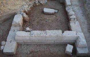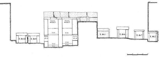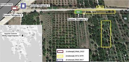 In the plain of Sicyon, north of the Classical city’s remains and divided by a large road is a large and important cemetery dating from the 7th to the 1st centuries BC. The cemetery was first identified in the mid 1960s during work for the construction of the Athens-Patras highway. Excavations in the mid 1970s and in 2013-2017 uncovered a 250 m-long stretch of the cemetery, comprising a total of 277 graves, primarily pits, some monolithic larnacae, and cist-graves. The deceased were occasionally accompanied by five to ten objects, mainly vases of Corinthian and Athenian workshops, figurines (associated primarily with children’s burials), metal objects, and, more rarely, jewellery. Burials of the 4th century occasionally feature a silver Sicyon coin placed on the deceased. Three funerary monuments dominate the cemetery area. Although the construction of at least one can be dated to the Late Hellenistic period at the latest, the monuments contain burials dating to the 2nd and 1st centuries BC, which suggest continuous reuse of the monuments particularly during the Roman period.
