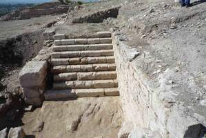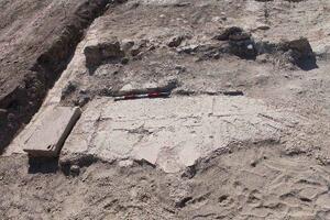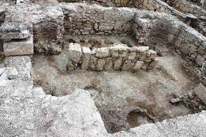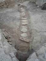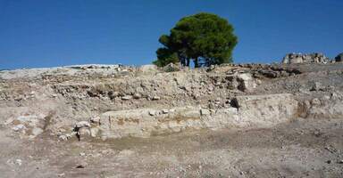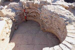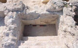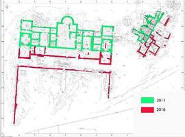 The 2012-2016 excavations at the Roman villa of Katounistra in Loutraki (Corinthia) revealed six further rooms and confirmed the structure’s absolute symmetry on the W-E axis (as well as the N-S axis). The shallow cavities of the room with the niches (Room 27) may indicate industrial use; two of the niches were later used as tombs (a funerary amphora was found inside one of them). Seven rooms of the adjacent bath were also excavated, revealing a marble bathtub, a bathtub of stone/brick masonry, a third bathtub linked to a water channel, and a three-niche piscina. South of the villa, the north, east, and west walls of a vast rectangular courtyard that stretches the entire length of the villa were investigated. Along the north wall were added a central double-aisled staircase, which leads to the villa, with mortar-covered floor, three rooms carved into the soft bedrock, and a fresco decoration. Traces of similar decoration were also noted on the two other courtyard walls. The pottery of the 2012-2016 excavations dates to the period from the 1st c. BC to the 6th c. AD, with much of it belonging to the 5th c. AD.