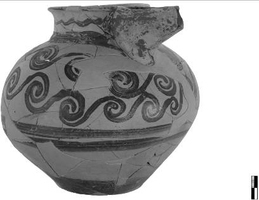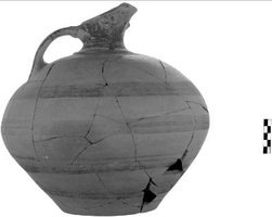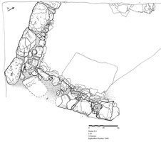 House B1 (Figs 5-6) to the southwest had (below a thick destruction deposit) remains of a well-beaten earth floor and a hearth from an upper storey (Fig. 7). Associated vases include two amphorae, two bridge-spouted jars, a cooking jar, and sundry cups and juglets (Figs 8-9), all LMIB in date. Stone weights, two querns, two stone tools (for making vases), a clay loomweight and a bronze fish-hook comprise the other finds. On the ground floor two complete pithoi were found set in pits: one was stamped (Fig. 10) 10 times by two seals on its rim and handle bases. The seals bore the motifs of a boat and a palm tree between hands: they look to be from a prism seal with hieroglyphic signs (such as those produced in the MMII Malia workshop). This and the pithos shape suggest they were made in MMII-III and would have been ‘heirlooms’ by LMIB.