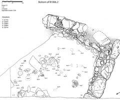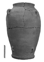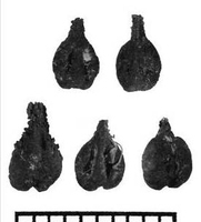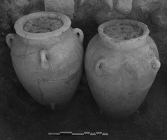 Environmental research is an important goal of the project. Some 350 samples have been collected from various layers, hearths and inside pots. For example, house A1 (room 5) has yielded olive pips and grape seeds. Workshop activities were investigated by sampling stone tools and storage vessels, which indicated the household processing of oil and wine. Fig seeds, almond and lentils have also been found. From the hearth and floor of house B1 came more olive pips and lentils, and from the pithoi (Fig .11), seeds of grapes (Fig. 12), perhaps from wine production. The large quantities of olive pips found in the hearths of two houses argue for their use as a fuel (as does the scarce indication of carbonized wood). Animal bones indicate that the inhabitants of house A1 ate goat, sheep and pig meat, and were especially partial to seafoods. More than 50kg of various shell and crab remains were collected. Even at the time of the destruction, they were preparing such fare in the yard: as demonstrated by a plate of bivalves and a bronze knife. A skeleton of a small dog covered by stones was found at the east of the yard.