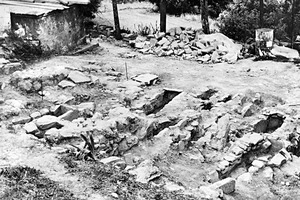 Kasanoi. E. Theocharopoulou reports on excavation at the Church of Christ the Saviour (Fig. 1). South of the church is a cemetery of cist graves and ossuaries in close proximity, arranged following the natural contours of the ground; the area explored is a small part of a larger burial ground (Fig. 2). The graves were covered by large sandstone slabs (without plaster). Associated pottery is mostly Christian, with some Ottoman.