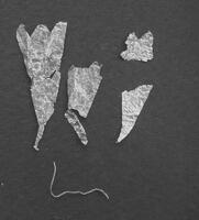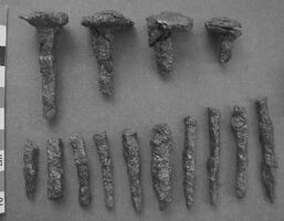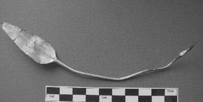 Nineteen graves, potentially comprising part of a Roman cemetery, were discovered. Ten of them (I, II, IV, VI, VIII, XII, XIII, XVI, XVII, XVIII) were simple pit graves, while eight others were roof-tiled graves (III, V, VII, IX, X, XI, XIV, XV). A built cist grave was also among the excavated ones (XIX). Most graves contained the remains of adults; however in graves IV and XVIII a non-adult was buried in each occasion. While some of the graves did not contain grave goods, finds such as iron nails (Fig. 2) in combination with traces of wood, suggest the existence of wooden coffins or beds for laying the dead. Other finds include glass unguentaria as well as a clay one (second half of 1st c. AD), bone fibulae and clay lamps, with one dating to the end of 1st-beginning of 2nd c. AD in grave IV. In six graves (VII, VIII, X, XV, XVI, XVIII) golden sheets/foils were used to decorate the garments or the heads of the deceased (Fig. 4). A silver leaf-shaped trowel was found in grave XI (Fig. 3).