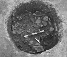 Most of the excavated pits were irregularly shaped, although some of them were circular (Fig. 3). Two of the circular pits were lined with pebbles (Fig. 4). Burning traces were identified in the majority of the pits, while some hastily-made hearths were detected inside two of them. The fills of the pits contained fragments of various types of vessels for daily use such as cooking pots, amphorae, drinking vessels etc., with some of them containing animal bones. In general the pottery dates to the end of the LM IIIB period and to the beginning of the LM IIIC period. Marine shells, ground stones and charred plant remains were among the finds as well. These pits were underground funerary repositories that potentially contained the remains of funerary feasts or cleansing rituals. It should be noted that soil samples were collected from almost all of the pits for flotation and environmental analysis.