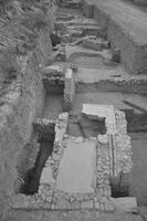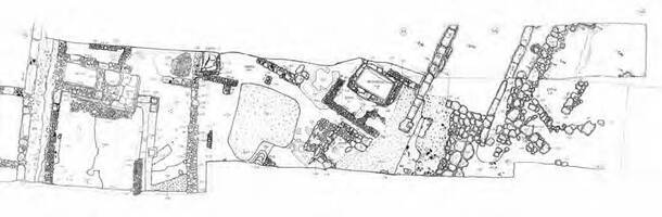 A water distribution construction was located between the fifth and the sixth housing blocks, dated in the Archaic times (fig. 6). It must have been constructed before the private houses, and it was oriented NE-SW. It remained in use until the fourth century BC, and its excavation produces a large number of small findings, including pottery, loomweights, clay figurines, bronze coins and iron nails. Its stratigraphy presented continuous disposals of material dated in the fifth and fourth centuries BC, and a lack of earlier findings was possibly due to the regular cleaning of the construction while it was still in use. A stone-paved street was located on its E side (fig. 6).