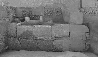 Part of a Π shaped altar (only the middle part) was located below areas I and II. The N part of the altar seemed to be purposefully destroyed, while the S part was not found. The altar was positioned within a large rectangular trench within the natural soil, and the stones serving as its foundations were positioned on top of the processed bedrock (fig. 4). It was noted that a large pyramid-shaped stone was found directly on the N side of the upper stone of the altar, possibly in order to serve as a signal of the ritual area, to avoid further construction on top of it. An offering layer was located in the E side of the construction, containing about 130 serving vessels (kylikai, skyphoi, kotylai), dated between the first half and the middle of the fifth century BC (fig. 5).
