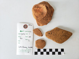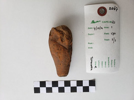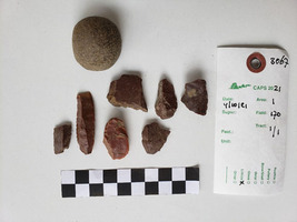 Les recherches de 2021 indiquent une occupation longue entre le Néolithique et l’époque moderne (fig. 4). Dans l’ensemble, 7632 objets ont été recueillis et étudiés. Les vestiges de constructions étaient endommagés par l’exploitation des champs, notamment dans les zones de mobilier d’époque romaine tardive et byzantine. On a également observé dans ces zones des traces de gestion de l’eau : une canalisation qui aboutit à une citerne moderne (construite sur une citerne plus ancienne) est visible sur un chemin de terre à l’Ouest de sources naturelles. Le mobilier recueilli dans ces champs, tessons de vases et fragments de tuiles, est très érodé. On y a également ramassé un peu de mobilier préhistorique (Age du Bronze/Néolithique).