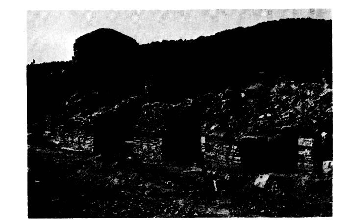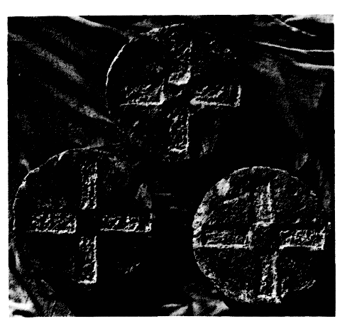 Reprenant, après dix ans d'interruption, la fouille du catholicon du monastère de la Pantanassa, P. Vokotopoulos en a dégagé, cette année, tout le mur Est jusqu'au soubassement (fig. 49). La base du mur est en appareil de blocs à encadrement de brique, tandis que la partie supérieure présente un parement en briques disposées, comme du côté Sud, selon la technique de la « brique cachée ». Parmi les trouvailles figurent plusieurs éléments du décor architectural en terre cuite du côté Est, notamment trois briques rondes ornées d'une croix en creux, qui devait être remplie d'une matière colorée (fig. 50). Ergon 1987 (1988), p. 69-70.