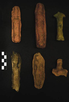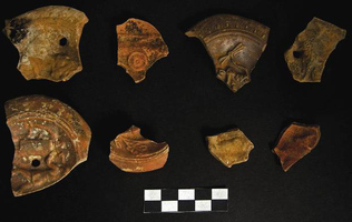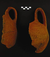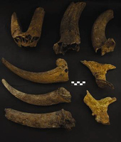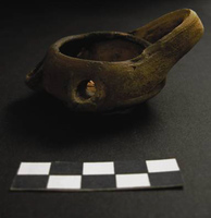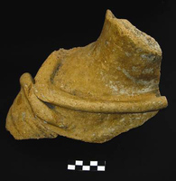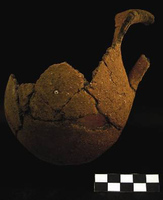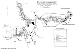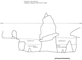 Melidoni. I. Gavrilaki (ΚΕ' ΕΠΚΑ) reports on excavation in the Gerontospilios cave (Fig. 1) from 1987-2008. The cave was used for habitation in the Final Neolithic/Early Minoan era, whilst from the Middle Minoan to the second- to first-century BC cult activities were dominant. The first phase, a yellow soil over the bedrock, is represented by typical occupation debris: stone tools (Fig. 2) and axes, obsidian and bone tools (Fig. 3), as well as a wide range of pottery including storage vessels. Later evidence shows varying foci of activities spread throughout the cave interior. Indications of fires of varying sizes (around which lie conical cups [Fig. 4], jugs and jars, and cooking pots [Figs 5) stand alongside heaps of stones and more deliberate arrangements of slabs (like Πs) which are usually Middle Minoan to Late Minoan in date. A large stalagmite to the north (Fig. 7) attracted numbers of mould-made female figurines (ca. 680-600 BC), and then seated females (Figs 8-10) and lamps of the third to fourth century BC (Fig. 11). Roman bone pins also appear here. A very large collection of mixed figurine types of Bronze Age and later date underline the devotional aspect of the cave’s use. Other finds typical of Hellenistic and Roman contexts include horns of deer and goat (Fig. 12), lamps (Fig. 13) and astragaloi. The focus of this worship may have altered by the second to first century BC, when inscriptions mention the god Hermes. The latest activity is also situated more towards the cave mouth. From the 15thcentury AD onwards, large numbers of graffiti and inscriptions record the names and dates of visitors of many nations.