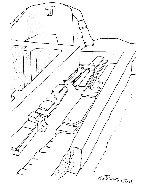 N. Moutsopoulos a repris, en 1987, pour le compte de la Société archéologique, l'exploration de ce site byzantin fortifié, concentrant les recherches sur l'intérieur de la basilique qui se trouve au sommet de la colline (v. BCH 107 [1983] Chron., p. 801). Dans l'abside du hiéron, la fouille a mis au jour la construction en deux parties de l'abside semi-hexagonale, la base de l'autel, deux niveaux de dallage et deux tombes plus anciennes qui avaient été soigneusement épargnées lors de la construction de la basilique. Dans la nef Sud on a découvert un grand nombre de tombes à ciste, qui témoignent de la fonction cimétériale de cette partie de l'édifice (fig. 92) ; plusieurs d'entre elles ont livré des vases et des monnaies, déposés tantôt à l'intérieur de la tombe – les monnaies près de la tête du mort –, tantôt sur la pierre tombale. D'autres sépultures ont été mises au jour dans la partie Nord-Est de l'édifice ; certaines d'entre elles étaient accompagnées de bijoux. Ergon 1987 (1988), p. 38-44.