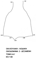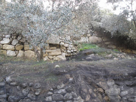 On the Koulakis-Liodakis plot (Fig. 12), two walls (north and south) of a room were found, with hints of the east wall preserved in the rock. At the centre of the room was a hearth, with a stone cylinder to its east. Outside, under a stone pile, a cistern (Fig. 13) was cut into the bedrock; this was probably covered with hydraulic cement. Associated pottery indicates its use in the second century BC.