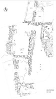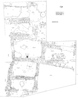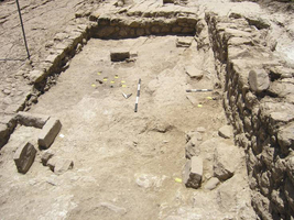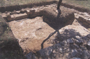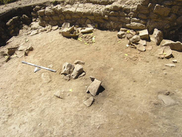 Further settlement remains were found on the Politakis plot (Fig. 14), comprising at least four covered spaces with a large yard to their east. Room A (Fig. 15) had destruction debris (tiles and stone) over its largely earth floor; stone slabs had been set on this surface at the northwest, with a small stone bench to the south and two further stone slabs, all perhaps to accommodate the storage vessels retrieved. What may be a stone hearth lay inside the entrance; vases, loomweights and burnt wood were recovered at the north. Along with the storage pithoi, the plain domestic wares (basins, jugs, plates and cups) date to the third century BC. A similar picture pertains in rooms Δ and E to the north. The yard had a rock surface sloping slightly to the east, into which were cut three small, rectangular pits running parallel to the wall and ca. 0.5m from it, which may have held wooden uprights for a lean-to shelter.