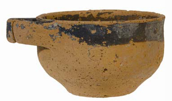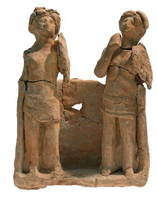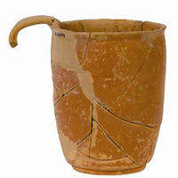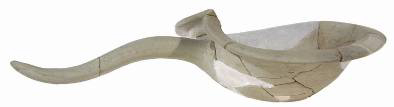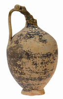 In the Koulakis plot (Fig. 3) lay a building terraced to follow the slope of the land (higher to the west). Parts of two rooms were excavated, with a further two less well understood: typically the walls are set on bedrock and still stand quite high; better dressed stone serves for jambs and thresholds, the floors are beaten earth and the roofs tiled. Room 1 (Fig. 4) has a squared stone base (perhaps to support a beam) by the east wall, a stone hearth and a large quern set just west of the doorway. These, plus the tablewares, suggest that food was prepared here. A terracotta model of two standing warriors armed with shield and spear on a support frame (Fig. 5) shows that other activities were practiced in the area, as is also suggested by the presence of a column krater (Fig. 6), a lamp and more than five braziers. To the east, room 2 (Fig. 7) is a storeroom with a covered drain set below the earth floors (of which three can be recognized). At the southwest, a structure built of stone slabs may be a hearth; in the centre of the room is a structure of four slabs with a hole within. To the south and east, eight or more pithoi and four amphorae are set by the walls, and of the 56 loomweights found in the room, 16 were inside a smashed pithos. The pottery from room 1 (especially the oinochoe [Fig. 8] and phiale [Fig. 9]) reveals clear ties to Knossos: other Cretan traditions are strong in such shapes as cylindrical cups (Fig. 10). Indeed, the braziers (Fig. 11) seem to recall the Minoan era. The structure was in use for about a century from the late third to the late second century BC.