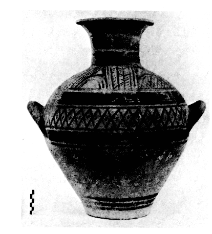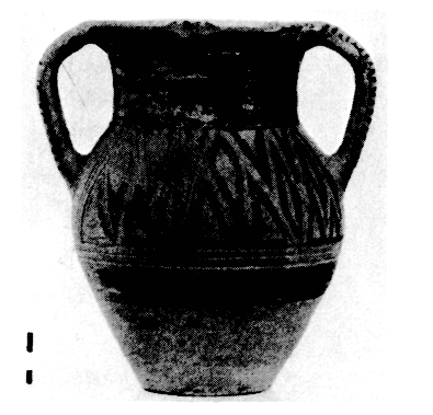 Une tombe à chambre protogéométrique a été découverte fortuitement, en 1979, non loin de la nécropole MR. Il s'agit d'une chambre de 9,50 x 10 m taillée dans la roche tendre et pourvue d'un dromos comblé par des pierres. Il contenait trois grands vases cinéraires (fig. 139) et un abondant mobilier : vases (fig. 140-141), armes en fer et en bronze, perles, etc. ArchDelt 34 (1979) [1987] Chron., p. 384.