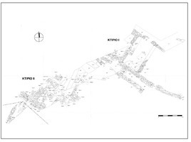 La colline de Magoula (superficie de 0,25 ha) se trouve à 700 m à l’Est de Karavos et à 200 m de la mer. La fouille s’est limitée à une superficie de 27 x 17 m. On a mis au jour, près du sommet de la colline, 38 segments de murs de longueurs variables (0,63 – 13.20 m) pour une épaisseur d’environ 0,50-0,70 m, construits en blocs de schiste. De ces segments de murs, on a pu reconnaître deux édifices, le bâtiment 1 (6,70 x13,20 m) et le bâtiment 2 (fig. 2-3). Dans le bâtiment 1, on a identifié deux pièces, dont l’une qui s’étendait sur une superficie de 17,3 m2 devait être la « cuisine ». Elle comportait une banquette appliquée le long du mur Sud-Est et était pourvue de deux foyers circulaires (diam. 1,20 m) associés à une couche de cendres recouvrant une couche d’argile. Le long du mur Nord, on a exploré une structure en creux (3 x 1 m) comportant des graines carbonisées, une brique, et le squelette partiel d’un animal. Sept vases ont également été trouvés sous le niveau de destruction. Un sondage contre le mur Nord-Est a montré que l’édifice repose sur une couche de destruction de l’HA II. Le bâtiment II, au Sud-Ouest du premier, repose lui aussi sur une couche de destruction de l’HA II. On y a recueilli de la céramique de l’HA et de l’HM, ainsi que des objets et des outils en pierre, en obsidienne, en quartz et en silex.