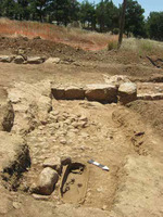 La partie fouillée du rempart a révélé deux états de construction. Le premier état est conservé dans la partie Sud de la fouille : deux segments se rencontrent à angle obtus. Le segment Nord (larg. 1,90 m) est construit en emplekton et blocs de taille. Le segment Sud est conservé au niveau des fondations et est constitué de petits blocs. Pour la datation de cette phase, la nécropole mise au jour à l’extérieur apporte des indications. Près du segment Sud, on a fouillé six sépultures, datées de la seconde moitié du Ve s. av. J.-C., tandis que près du segment Nord, on a observé une grande concentration de vases brisés et de figurines associés à une couche de cendres. Il s’agirait peut-être d’une zone de purifications, ce qui expliquerait l’absence d’os. La fourchette chronologique est ici plus large : on compte des lécythes à figures noires du début du Ve s. av. J.-C., ainsi que des vases à figures rouges (pyxides et lécythes-aryballes) de la fin du Ve s. av. J.-C. Il est certain que le rempart et la nécropole forment un ensemble à cet endroit : le rempart semble avoir fonctionné pendant tout le Ve s. av. J.-C.