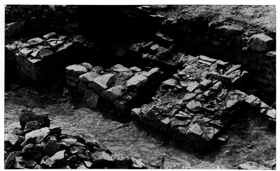 2) Région au Sud de la mine n° 3. — Trois nouvelles maisons classiques ont été partiellement mises au jour. L'une d'elles, de construction soignée, avec sol et murs stuqués en rouge et en blanc, fournit un terminus post quem pour la reprise de l'exploitation minière après l'époque préhistorique, car l'un de ses murs fut intégré dans le péribole construit autour de l'accès de la mine (on sait en effet que les données stratigraphiques font entièrement défaut pour la mine n° 3). Les deux autres maisons, fondées sur le rocher, bordent une rue qui a été dégagée sur 30 m de long au Sud du péribole de la concession minière.