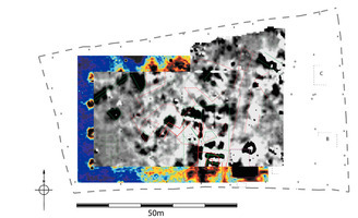 Resistivity survey to the west of trench G shows a well-defined rectangular area 6m x 3.5m which could be a kiln, oven or furnace (Fig. 1). Other strong magnetic features, roughly circular in shape, may be furnaces or burned features (Fig. 2). The resistivity survey also shows a wide north-south anomaly (10m long x 3m wide) with an attached rectangular area to the east making a square feature 7 x 7m. This feature could be architectural and the apparently very wide walls might be a result of its collapse. It coincides with the very strong magnetic feature described above and could be a built furnace or kiln. Weak north-south features are evident in both survey and magnetometry data and may be interpreted as terracing or roads. Two possible collapsed architectural features were located in the north central and the south central part of the survey area. The northern feature is oriented northeast-southwest and may be collapsed architecture. The southern one represents a square (ca. 7 x 7m) architectural feature. The results of the magnetometer survey concur with these anomalies.