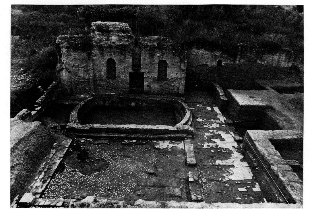 L'espace, qui est occupé par un bassin et une cour péristyle, a été presque entièrement dégagé (fig. 40-41). Le bassin (5,50 χ 9,50 χ 1,30 m) est directement lié au mur de façade. Il était pourvu de deux marches intérieures sur les côtés Nord et Ouest, de deux tuyaux d'alimentation dont les restes sont visibles au milieu des deux petits côtés curvilignes, et d'un conduit d'évacuation partant de l'angle Nord-Est en direction de l'Alphée au Sud-Est. La cour adjacente au Nord mesure 6 x 8 m. Le bassin et la cour étaient entourés par un portique en Π, dont le mur de fond constituait la limite de l'ensemble à l'Est, tandis qu'à l'Ouest il était percé d'une ouverture de 7,30 m de large pourvue de deux colonnes, qui donnait accès à une vaste pièce de 7,50 x 10 m flanquée de deux autres plus petites. La limite Nord du complexe n'a encore été recoupée que dans deux petits sondages.