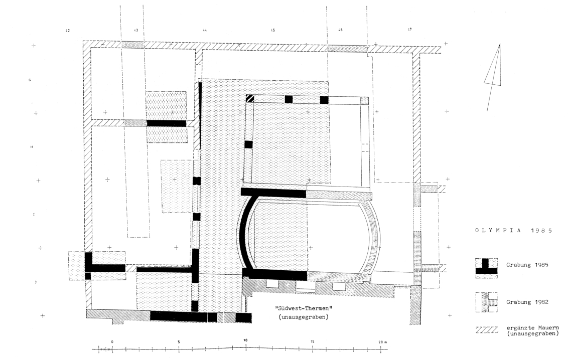 Sous la responsabilité de H. Kyrieleis et sous la conduite effective de U. Sinn, les travaux ont repris, en 1985, dans le sanctuaire de Zeus. Les recherches ont porté sur le bâtiment romain en brique situé au Sud-Ouest du Léonidaion et connu sous le nom de « thermes Sud-Ouest ».