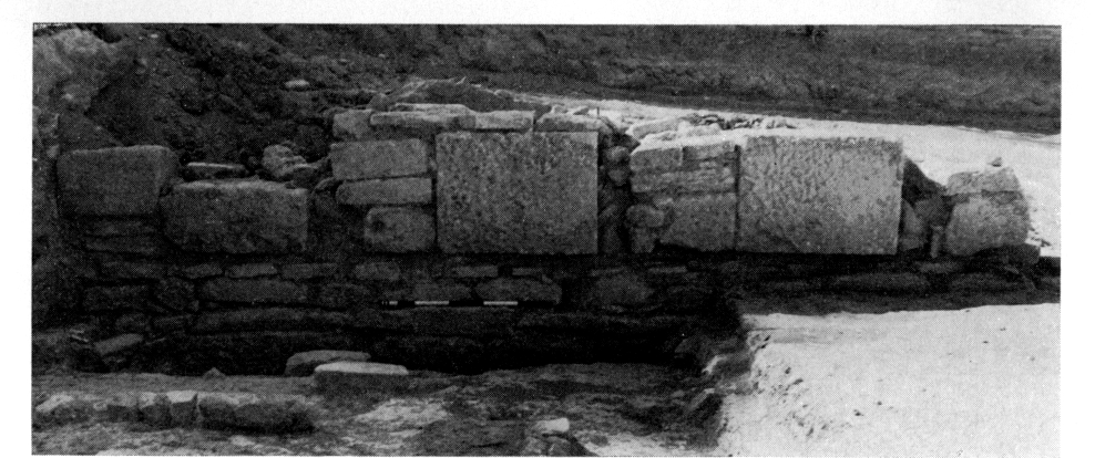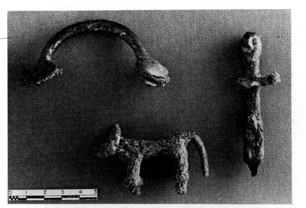 Parmi les constructions d'époque historique, on a presque achevé la fouille de l'édifice Q, qui date du VIIe siècle av. J.-C. Il mesure 5,80 m de large sur 38 m de long au moins, et contenait une telle quantité d'amphores de transport — originaires pour la plupart de Grèce de l'Est — que l'on ne peut s'empêcher de conclure à un commerce local d'huile ou de vin, peut-être en rapport avec le sanctuaire. Immédiatement au Nord, un dépôt stratifié en relation directe avec le temple a permis de compléter la séquence, livrant notamment de nombreuses figurines fragmentaires en terre cuite ainsi que plusieurs petits bronzes d'époque protogéométrique et géométrique (fig. 139). A l'extrémité Est du terrain on a complété la fouille de la maison hellénistique E.