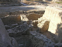 Fig. 1/ BR 2010. The Greek Sanctuary (above, right) was built upon erosion layers accumulating upon the Minoan buildings (below, left). Scarps are supported by walls and vertical cementing techniques.