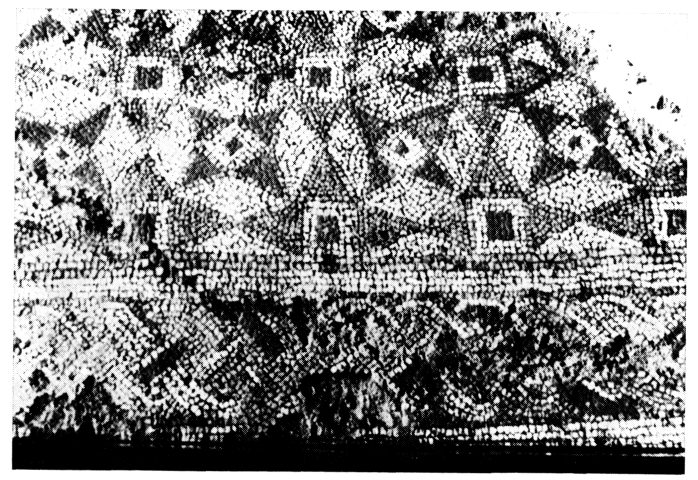 10) Basilique cimétériale. — On a extrait du remblai de nouveaux éléments d'architecture ; dégagé la mosaïque du naos, qui est bien conservée (fig. 119), ainsi que le sol de la nef et du narthex, qui est pavé en briques ; découvert, à l'extérieur du narthex, une stèle funéraire en place avec l'inscription Μημόριον Μάγνας et une table (à offrandes ?) faite de quatre piliers et d'une plaque de chancel remployés.