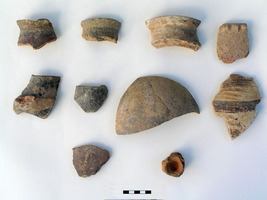 Las, Kastelli. E. Zavvou (formerly Ε’ ΕΠΚΑ, now Epigraphical Museum) notes a scatter of prehistoric sherds and traces of wall on this seaside hill, and on the neighbouring height (Miniones). A Mycenaean kylix stem was found in the small ravine between the hills. Middle Helladic pottery from the Kastelli site included dark burnished and matt-painted wares, and well as one sherd with red-on-black decoration which may be Minoan (Fig. 1).