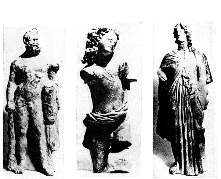 1) La fouille de l'habitat fortifié (fig. 155) a porté d'une part sur trois maisons, dont on a dégagé les états correspondant aux phases 2 et 3 et sondé l'état de la phase 1 ; d'autre part sur le secteur Sud (près de la mer), où la fouille n'est pas descendue au-dessous du niveau 2. Outre la céramique, qui compte de nombreux tessons inscrits, la fouille a produit une monnaie d'or d'Arsinoé Philadelphe (vers 270 av. J.-C.) et un grand nombre de statuettes en terre cuite, dont une de Cybèle, deux d'Héraklès (fig. 157), un petit Éros (fig. 158), des fieurines masculines et féminines (fig. 159), plusieurs protomès féminines, etc.