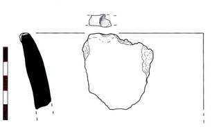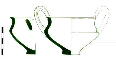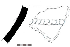 Pyrgaki-Tsouka. J. Rambach (for the Ζ’ ΕΠΚΑ) reports on excavation in 1998 of a small mound which was shown to be a burial tumulus used at least in the later part of the MH period (and perhaps from MHI). The mound was severely damaged by Late Roman-Early Christian burials cut into it. Nonetheless, a MHII/III kantharos was recovered (Fig. 1), and next to it many sherds of a large pithos with relief decoration (Fig. 3). Part of the rim of a second pithos with finger-impressed decoration on the rim was also found (Fig. 2).