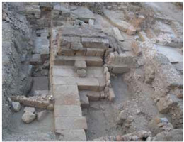 Dans la partie Sud de la fouille, en effet, on identifie deux segments du rempart qui forment un angle (fig. 1-4). Le segment Sud, orienté Nord-Sud, et large de 3,50 m, a été mis au jour sur une longueur de 4,50 m. Le segment Nord, orienté Est-Ouest, de même largeur, a été mis au jour sur une longueur de 5,50 m. Son parement Nord est conservé sur 2,50 m de hauteur, constitue le parement principal, en orthostates avec des bandeaux lisses. L’élévation est perturbée sur une hauteur de 3 assises et complétée par du mortier, mais à partir de la 4e assise vers le bas, les blocs sont en place, en carreaux et boutisse.