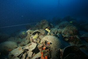 Première campagne de fouille sur une épave pleine d’amphores de la fin IIe-début Ier s. av. J.-C., qui avait été repérée en 2007 à une profondeur de 40 à 45 m au large de Styra (fig. 1-2).