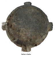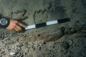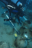 Après le relevé des vestiges superficiels par photogrammétrie, deux sondages ont été effectués afin de déterminer la stratigraphie de l’ensemble (l’épave et sa cargaison, et les dépôts sédimentaires). Parmi les objets qui ont été remontés, on signale des amphores de type Brindisi, de la vaisselle de table, une vasque en pierre (fig. 3), des clous en bronze et en fer, des éléments appartenant à la structure du navire (fig. 4) ainsi que des tuiles provenant d’une structure sur le pont, de même que des fragments de sculpture en bronze. Des éléments de la coque en bois du navire ont été découverts dans le sable, en bon état de conservation.