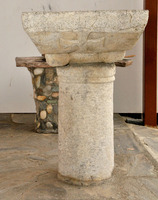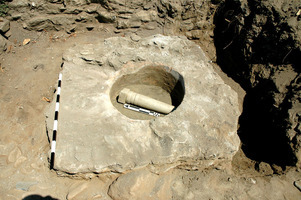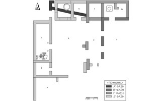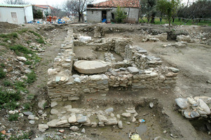 La fouille du terrain Kalagia-Konstantinou a livré un ensemble d’édifices protobyzantins, quatre corps de bâtiments autour d’une cour centrale, d’une surface totale de 25 x 25 m, construits en quatre phases et liés à la basilique protobyzantine découverte sur le terrain adjacent en 1973 (fig. 1). Une première phase de construction est matérialisée, sous l’aile Nord, par des murs d’orientation différente de l’ensemble. Dans une deuxième phase (milieu du VIe s., période de Justinien d’après les monnaie), un exonarthex se serait ajouté à la basilique (pièce 1). Un portique à l’Ouest (pièce 2) et un baptistère (pièce 3, fig. 2) auraient été construits dans une troisième phase (troisième quart du VIe s., d’après une monnaie de Justin II). Enfin, après la fin du VIe s., se sont installés autour de la cour des espaces de stockage et de production d’huile (presse à huile circulaire dans la pièce 5; fig. 3).