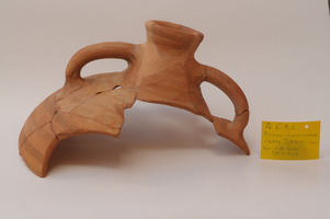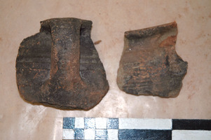 L’interprétation de ces pièces n’est valable qu’en relation avec la basilique du terrain voisin (fig. 4). Le mobilier recueilli est constitué essentiellement de céramique protobyzantine : des fragments de pithoi, de grands vases, de céramique de cuisson et d’usage quotidien et d’amphores LR2, liées à la production d’huile. On signale également une assiette au décor peint et un verre à pied utilisé probablement comme lampe à huile (fig. 5-6).