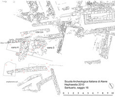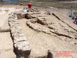 Terrain Lazaridis. – En 2010, la fouille s’est poursuivie dans le temple de la fin de la période archaïque à Héphaistia, dans la région de l’isthme, dans le but d’explorer les pièces 3 et 4 qui constituent l’extrémité Ouest de l’édifice de culte. Le sondage 16 a été prolongé de 3 m vers le Nord et de 9 m vers le Sud (fig. 1-2).