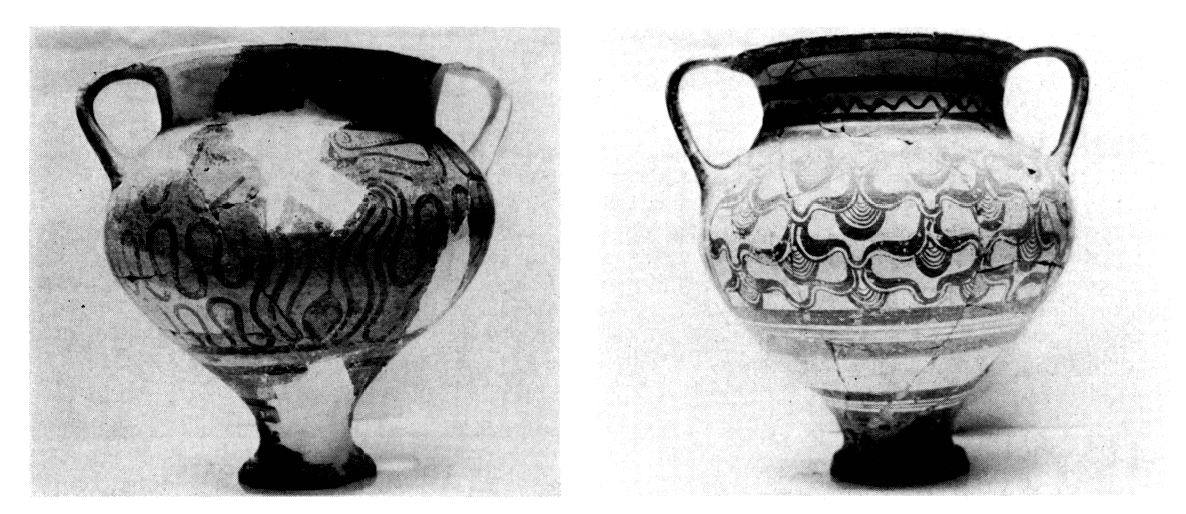 La présence minoenne et mycénienne est elle aussi attestée par des trouvailles superficielles faites sur une vingtaine de sites — habitats et nécropoles — également concentrés dans le Sud de l'île, autour de Pigadia, d'Afiartis et d'Arkassa. Dans cette dernière région, outre les ramassages de surface, une tombe à chambre minoenne, découverte fortuitement au lieu-dit Voniès, a fait l'objet d'une fouille de sauvetage en 1978-79. Elle abritait plusieurs inhumations, dont une dans un larnax, et les restes d'une sépulture à incinération. Le mobilier funéraire se compose d'une cinquantaine de vases et de deux bagues en bronze. Parmi les vases on signale notamment quatre grands cratères amphoroïdes (fig. 150-151), plusieurs amphorisques à étrier, des petites cruches, des tasses, des skyphoi (fig. 152), une coupe à pied et un askos cylindrique (fig. 153). L'ensemble date du MR III Β et certaines pièces paraissent avoir été importées de Crète orientale. Καρπαθιακαἰ Μελέται 1 (1979), p. 131-192 ; 2 (1981), p. 99-162.