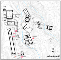Le plateau du portique – Afin de mieux comprendre la relation chronologique de plusieurs structures à l’Est du portique, trois sondages ont été ouverts dans le secteur du bâtiment Est. Deux des sondages, implantés près des murs Nord et Sud du bâtiment Est, à l’Est de l’espace dallé ont confirmé que les fondations du bâtiment Est reposent sur le sol naturel du plateau (fig. 5). La céramique associée à cette surface date du IVe s. av. J.-C.