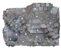 La pièce K. Dans le secteur du réfectoire à l’Ouest du ravin central, les recherches dans la pièce K a confirmé la séquence stratigraphique révélée en 2022, notamment l’hypothèse selon laquelle la cage d’escalier était construite sur une couche de moellons datée de la fin de l’époque hellénistique-début de l’époque impériale (fig. 4). Le matériel recueilli dans la couche de moellons confirme qu’il s’agit d’un remblai provenant du plateau du portique. Une couche de sédiments noirs qui repose sur un sol en argile constitue une transition nette entre l’état plus ancien de la pièce et le remblai de moellons. De même, une structure composée de blocs de calcaire dans l’angle Sud-Ouest du sondage semble appartenir à un état ancien, comme le sol d’argile. La fonction de la structure en calcaire n’est pas claire, mais ses dimensions et sa relation avec le mur de soutènement plus ancien immédiatement à l’Ouest et la présence d’un sol indique que la pièce K n’avait pas été à l’origine une cage d’escaliers, mais plutôt un espace articulé dans le réfectoire.