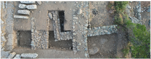 La porte Ouest. - La fouille de la pièce 2 de la porte Ouest s’est concentrée sur deux secteurs. Un sondage a été ouvert entre les deux sondages de 2023 qui a permis d’obtenir une coupe stratigraphique à travers la pièce 2. On a dégagé des blocs de calcaire, dont l’état de conservation érodé indique qu’ils ont été exposés pendant une longue durée. Une extension du sondage a fait apparaître d’autres blocs de calcaire effondrés à travers le passage vers la pièce 1. Ces blocs ont été partiellement retirés, afin de faire apparaître le niveau du toichobate qui avait été atteint dans la pièce 1 en 2023 : celui-ci comportait des encoches pour recevoir des stèles qui se poursuivent dans le passage. Étant donné que ce dispositif s’étend tout autour du mur et du mur du passage, on estime qu’il ne devait pas y avoir de prote.