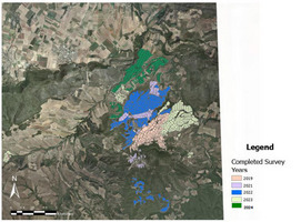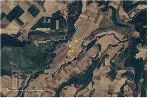 Au cours de la campagne de terrain, les préparatifs pour l’installation des panneaux solaires et d’une tour électrique ont fait apparaître des structures antiques, comme par exemple des tombes à tuile et ce qui a été identifié à une tombe à tholos du début de l’Age du fer (2024-F1). À un autre endroit, on a mis au jour les restes d’une canalisation en terre cuite (2024-F2) datée de l’époque ottomane. Elle est probablement à mettre en relation avec une citerne identifiée en 2021. Les vestiges d’une tombe de nourrisson hellénistique (2024-F3) ont été repérés à un autre endroit. Au Sud de la route entre Kallithea et l’Eunipe, on a repéré une levée de pierres recouverte de buissons : il s’agit d’une tombe à tholos du début de l’Age du Fer et cette découverte fait passer le nombre de tombes à tholos connues dans ce secteur à 25 (fig. 2). Ces tombes à tholos étaient déjà connues par Dimitris Theocharis (AD 1964). Aujourd’hui on repère à divers endroits au Sud-Est de Platanos (2024-F11 a-m) des empierrements qui pourraient être interprétés comme des tombes à tholos : ils sont relevés et décrits selon une typologie précise et sur les 64 qui ont été examinés, 9 de ces empierrements pourraient être effectivement des tombes.