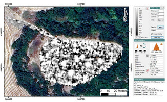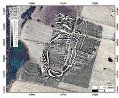 En parallèle aux prospections pédestres, on a effectué une prospection géophysique, dirigée par (Université de Thessalonique) sur deux sites majeurs de la région : Platanos Magoula (près du toponyme Gogou ; fig. 3) et Kastraki (près du toponyme Arabises ; fig. 4), à l’Ouest du village d’Aghios Antonios. La zone a été explorée par prospection magnétique. À Kastraki (Arabises), on a constaté des anomalies linéaires à plusieurs endroits du site, notamment dans la partie Est, on observe un mur orienté Est-Ouest, ainsi que des structures plus petites. On a observé une structure circulaire (abside ?) dans la partie centrale du site, et sur les côtés Nord et Ouest, ce qui pourrait ressembler à un enclos arrondi ou ovale. Comme les prospections pédestres avaient recueilli du mobilier de l’époque mycénienne et du début de l’Age du Fer dans le champ au Nord de Kastraki, on y a également fait une prospection magnétique qui a révélé une anomalie circulaire à une profondeur de 1,20 m. Il s’agit peut-être d’une tombe à tholos précédée d’un dromos avec une deuxième chambre funéraire. À Platanos Magoula (Gogou), la prospection détecte des anomalies linéaires et courbes. On interprète les anomalies positives comme des fossés, tandis que les anomalies négatives sont interprétées comme des structures en fondations.