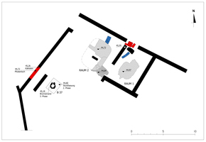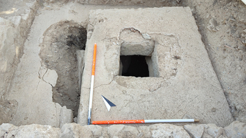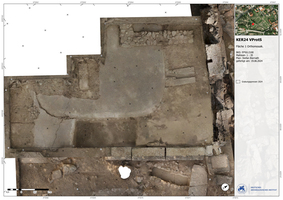 Work has been conducted to the so-called ‘banquet room’, a fourth-centrury BCE structure discovered in 2023 (ID 19629 ), off the Sacred Way, along with the area to the west. This 15m2 room featuring an oval mosaic of polished pebbles was reveiled (Fig. 1 and 2). The mosaic does not extend to the building's walls on the east and north sides. To the north, a white limestone drainage channel was found connecting the rooms, suggesting a water-management system, while lime deposits along the southeastern curve of the mosaic and to the north, towards the limestone channel, indicate that this room was frequently used. In the southwestern part of the site, a second trench was opened in the area of Well B 37. Three construction phases of the well were documented. An initial lining with large limestone monoliths; second, the well rim, covered with a compact layer of lime mortar (Fig. 3.3); and lastly, a rectangular casing made of limestone blocks, placed into the mortar.